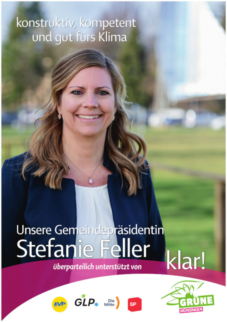 Stefanie Feller ist eine gewinnende, engagierte, nahbare und zukunftsorientierte Persönlichkeit. Im Gemeinderat schätzen wir Ihre grosse Fachkompetenz, sie denkt strategisch und findet pragmatische Lösungen zum Nutzen unserer Bürgerinnen und Bürger. Sie stärkt unsere nachhaltige Entwicklung, fördert den Dialog zwischen den Generationen und steht für eine transparente und bürgernahe Politik und ein lebenswertes Münsingen. Stefanie Feller verdient unser Vertrauen… sie ist die beste Gemeindepräsidentin, die ich mir wünschen kann.