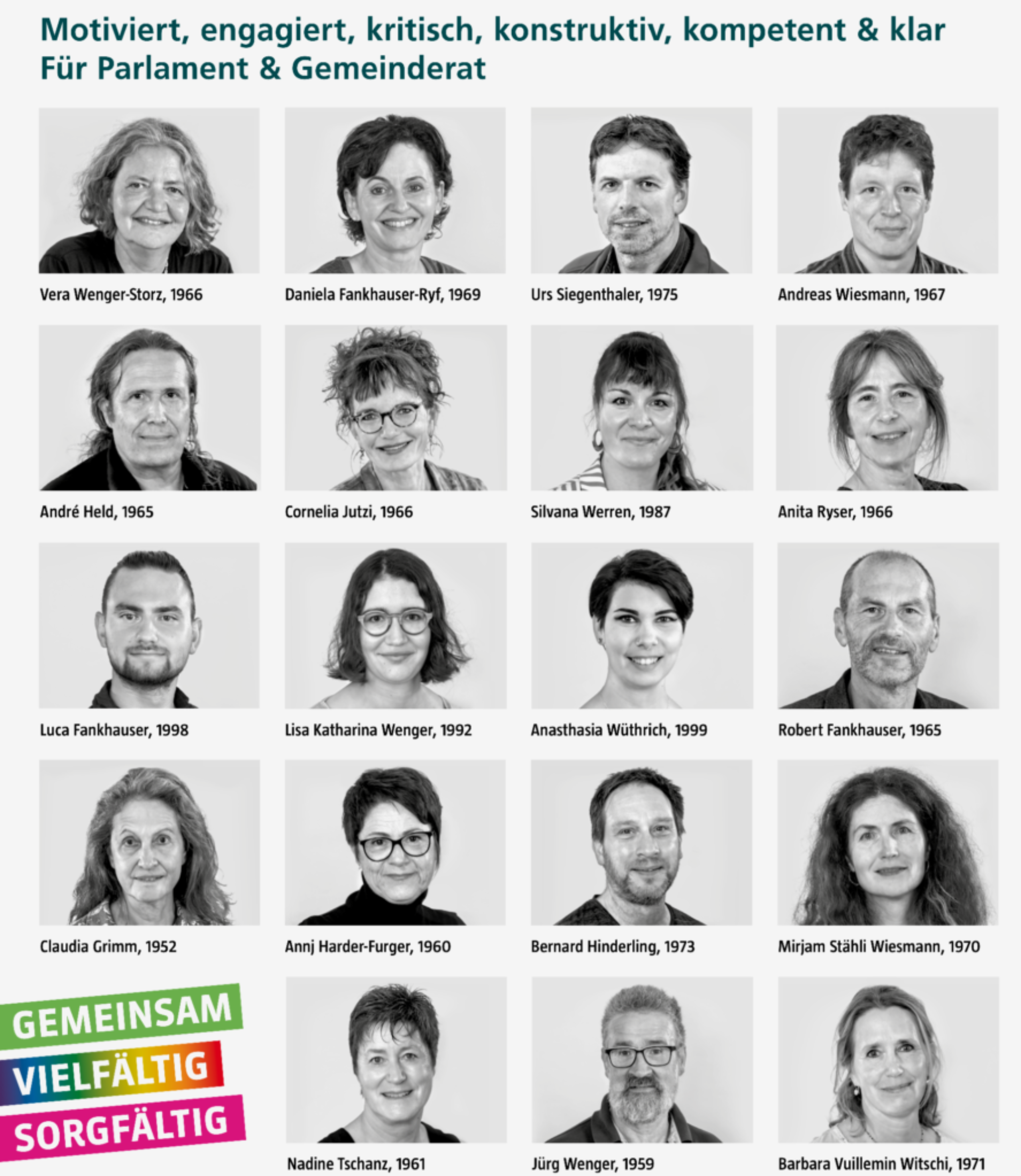 Fürs Parlament kandidieren19 kompetente Kandidatinnen und Kandidaten. Wir setzen auf die Bisherigen Daniela Fankhauser, Urs Siegenthaler, Andreas Wiesmann, André Held, Cornelia Jutzi sowie Silvana Herren, Anita Ryser, Luca Fankhauser, Lisa Wenger, Anasthasia Wüthrich, Robert Fankhauser, Claudia Grimm, Annj Harder, Bernard Hinderling, Mirjam Stähli, Nadine Tschanz, Jürg Wenger und Barbara Witschi.