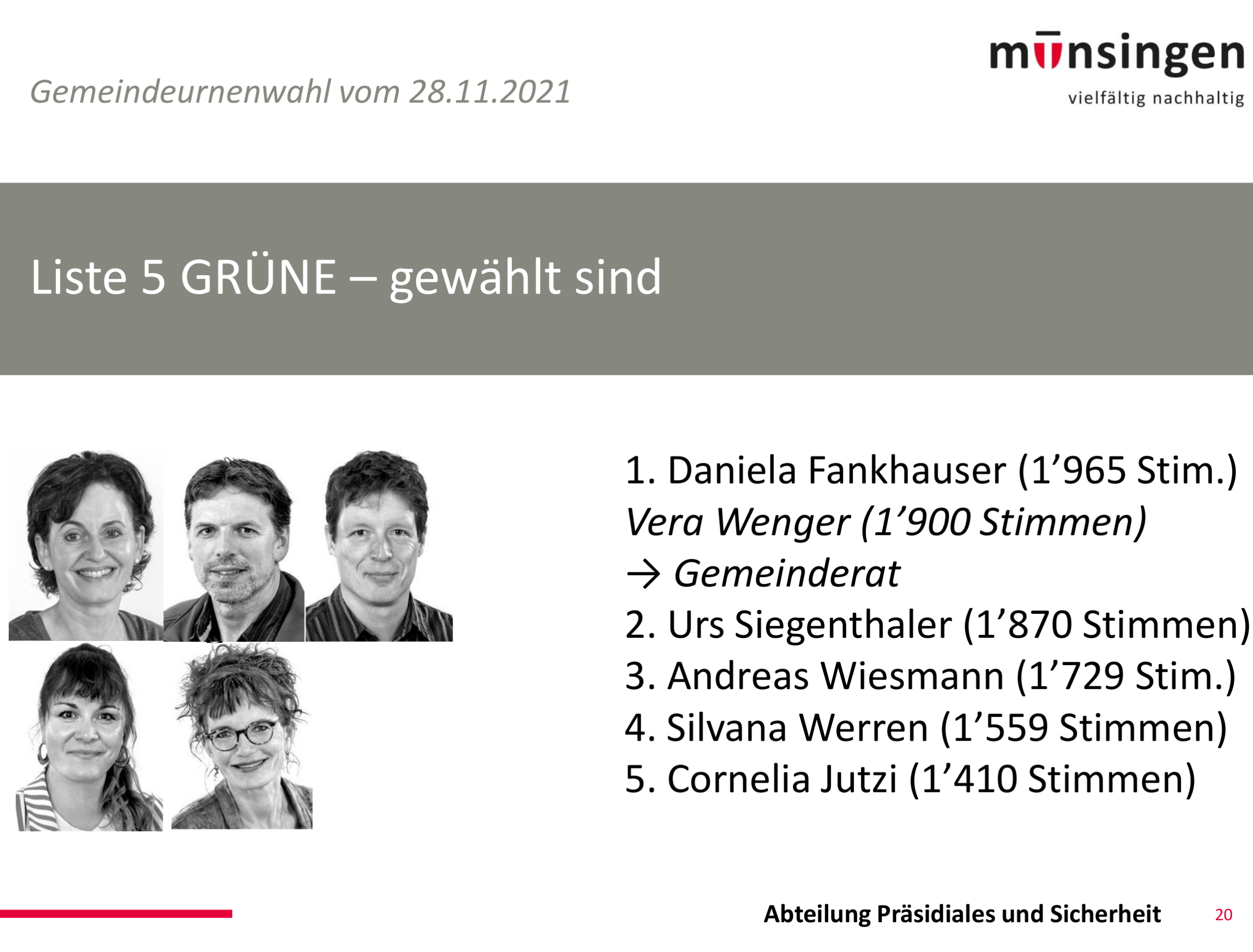 Herzliche Gratulation zur Wiederwahl! Vera Wenger wurde mit einem sehr guten Resultat wieder in den Gemeinderat gewählt. Im Parlament schafften die Bisherigen Daniela Fankhauser, Urs Siegenthaler, Andreas Wiesmann und Cornelia Jutzi die Wiederwahl. Das Quartett wird durch Silvana Werren verstärkt die auf Anhieb den Sprung in die Legislative schafft. Herzliche Gratulation allen Gewählten und Befriedigung im Amt. Wir danken allen Kandidierenden, Unterstützer*innen und Wähler*innen herzlich für die Unterstützung!