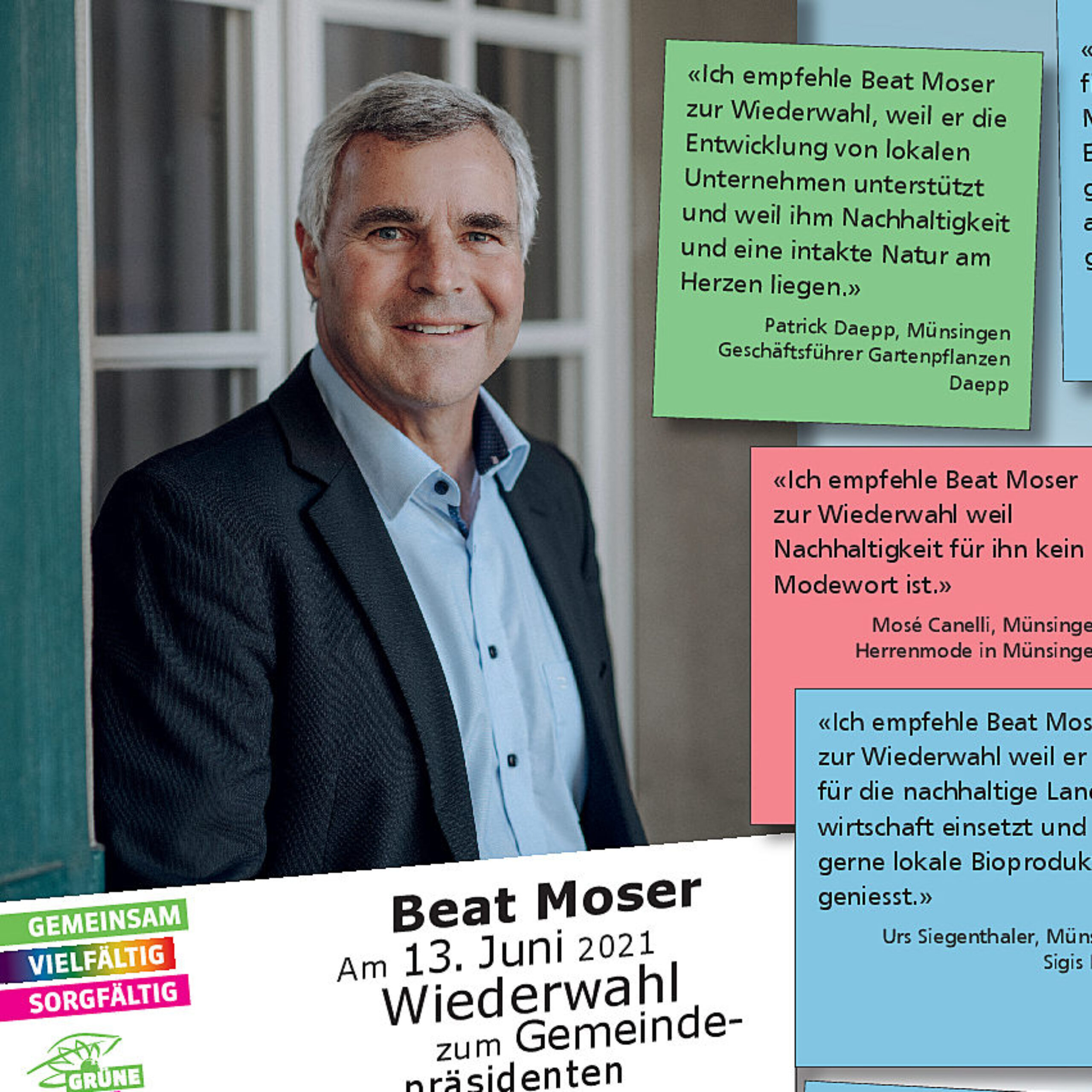 Wir freuen uns über die breite überparteiliche Unterstützung für Beat Moser. Zahlreiche Privatpersonen und Exponent*innen aus Kultur, Sport, Wirtschaft und Politik unterstützen Beat Moser mit einem Testimonial. Auch die Ortsparteien EVP Münsingen, GLP Münsingen, „Die Mitte  Münsingen“ haben in Medienmitteilungen vom 21. respektive 26. Mai 2021 und  1. Juni die Unterstützung für die Wiederwahl von Beat Moser bekannt gegeben. Wir danken allen für das Vertrauen, die Wertschätzung und die Unterstützung von Beat Moser.