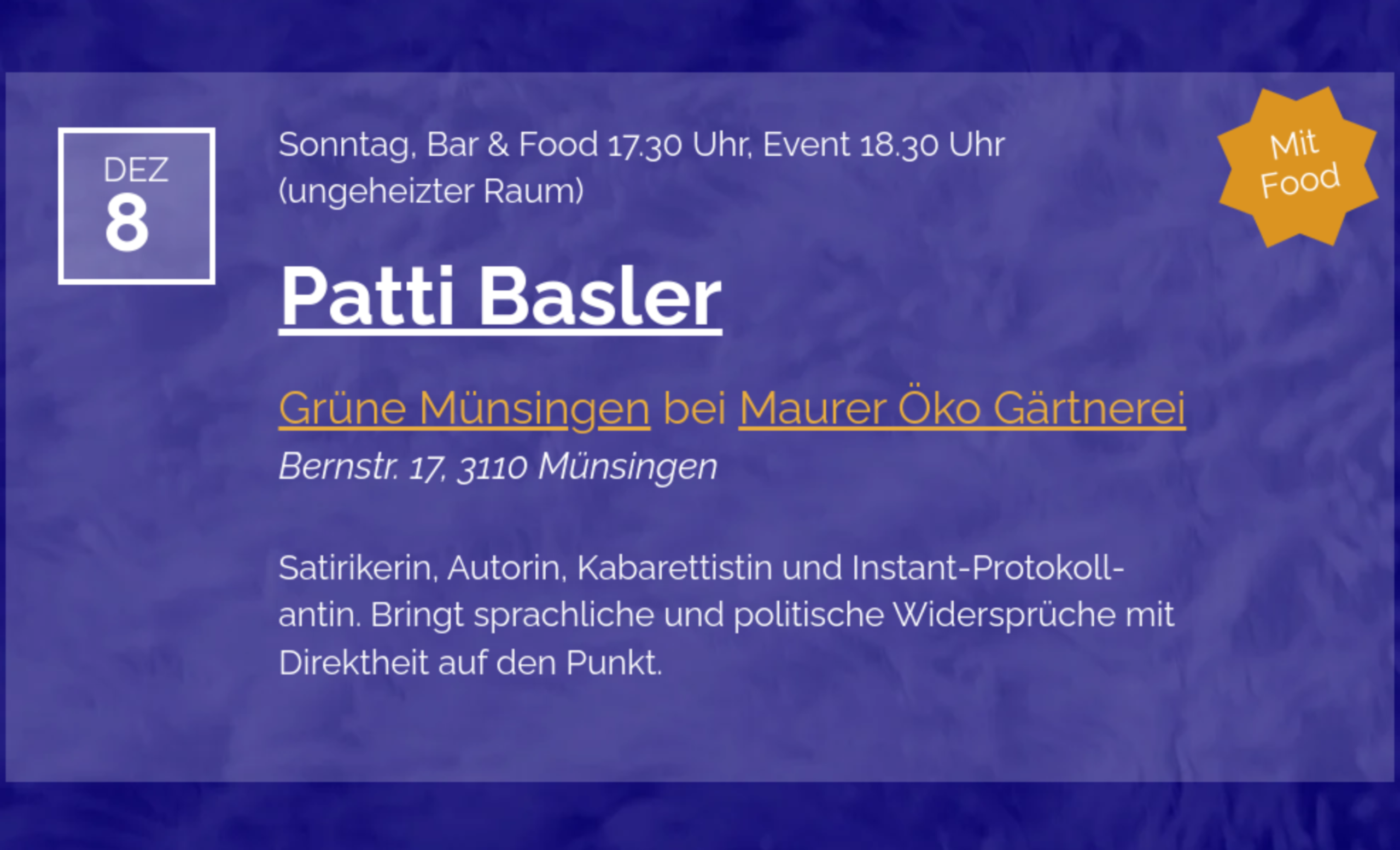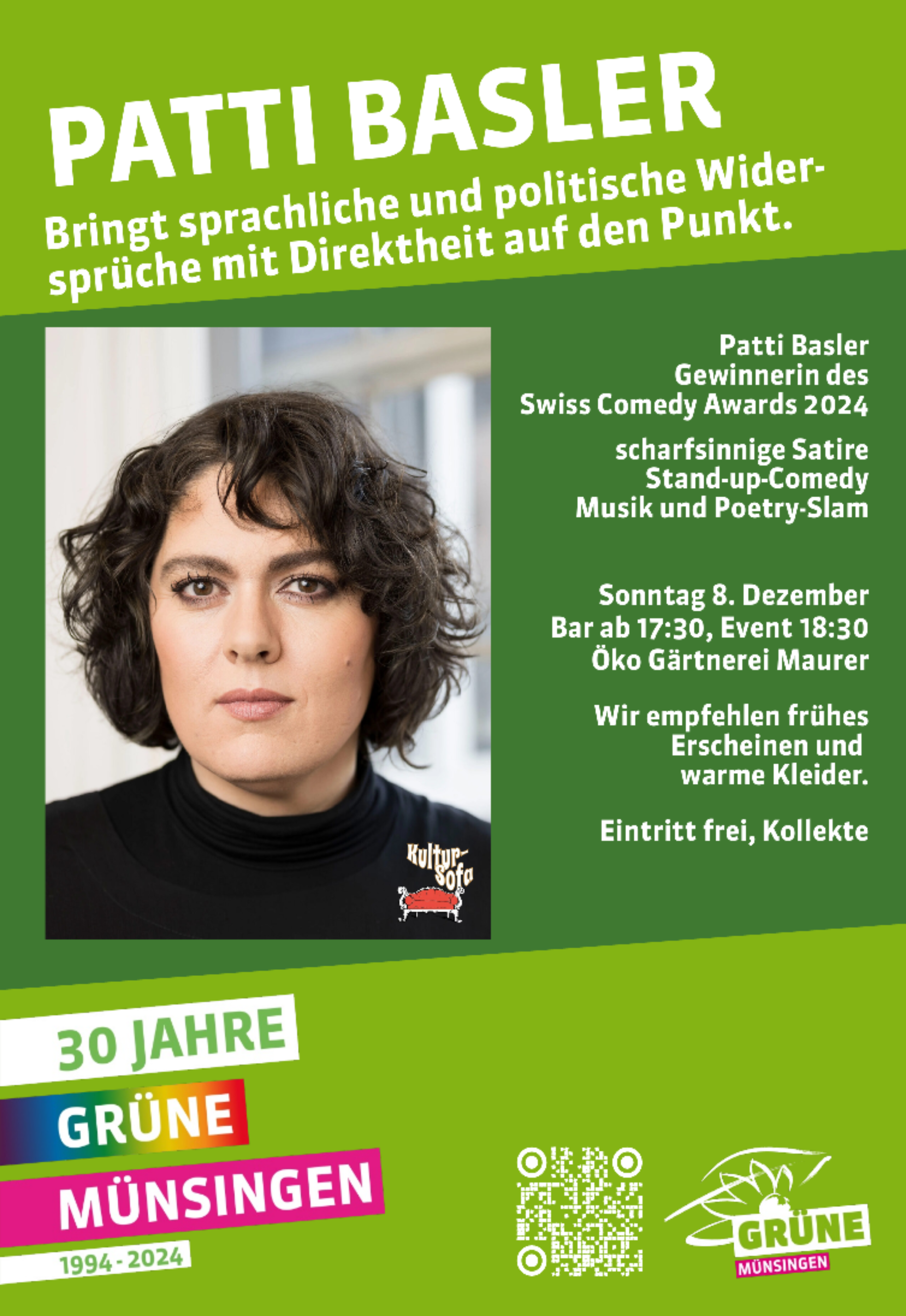 Wir freuen uns im Rahmen „30 Jahre GRÜNE Münsingen“ Patti Basler am Kultursofa 2024 begrüssen und geniessen zu dürfen. Wir empfehlen frühes Erscheinen und warme Kleider!
