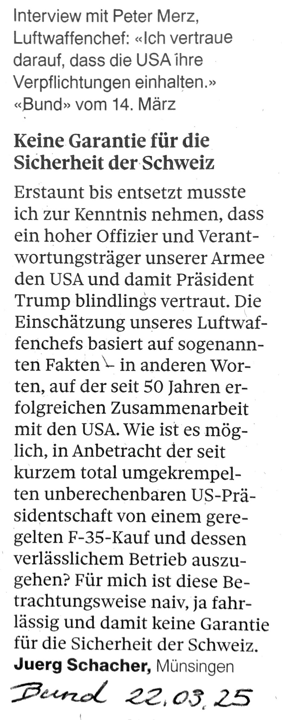 Interview mit Peter Merz, Luftwaffenchef in „Der Bund“ vom 14. März.