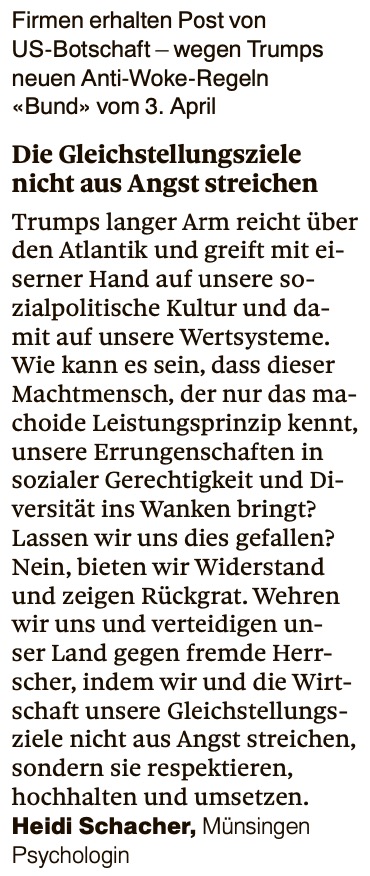 Leser:innenbrief von Heidi Schacher im Bund vom 12. April 2025 „Die Gleichstellungsziele nicht aus Angst streichen“
