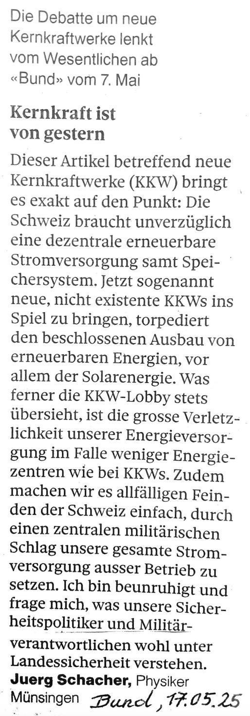 Leser:innenbrief von Jürg Schacher im Bund vom 17. Mai 2025 „Kernkraft ist von gestern“